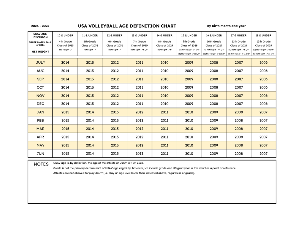 The chart to the right shows the age definitions for USAV. Find the players birth month in the left-hand column and follow across the row to the birth year; the heading at the top of the chart indicates the the correct age level for the player.